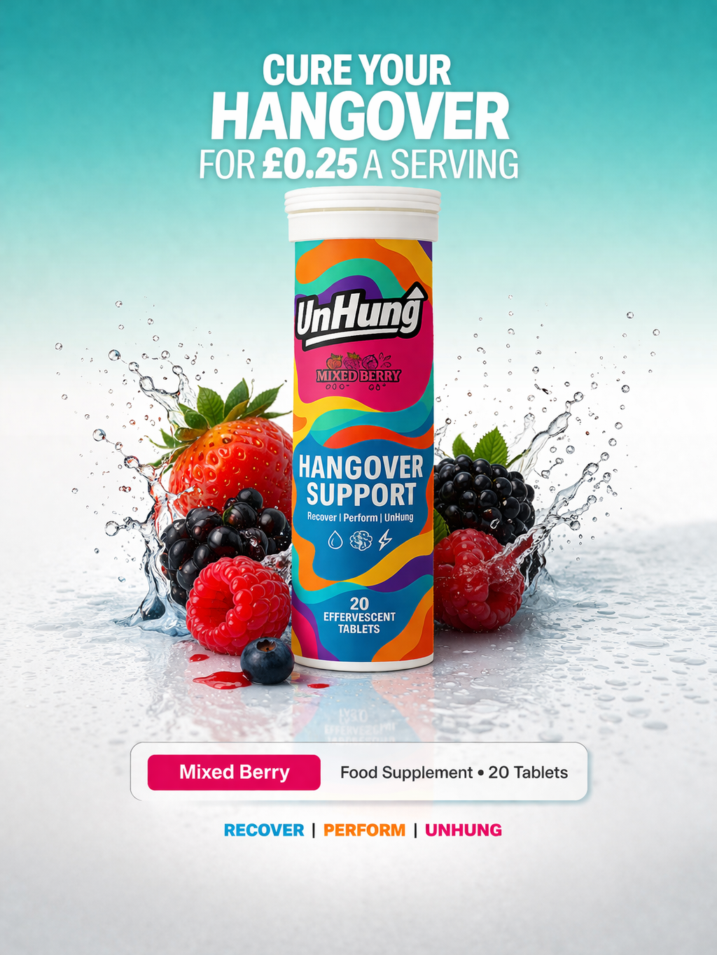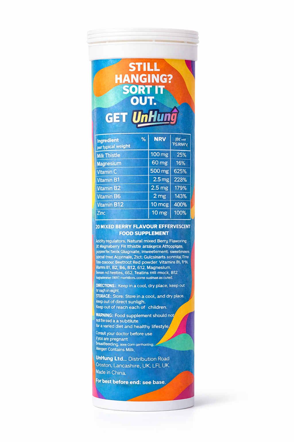 Whether you’re heading to lectures, brunch, or straight back out again, UnHung gets you back on your feet. Just drop, fizz, and drink your way to recovery.
